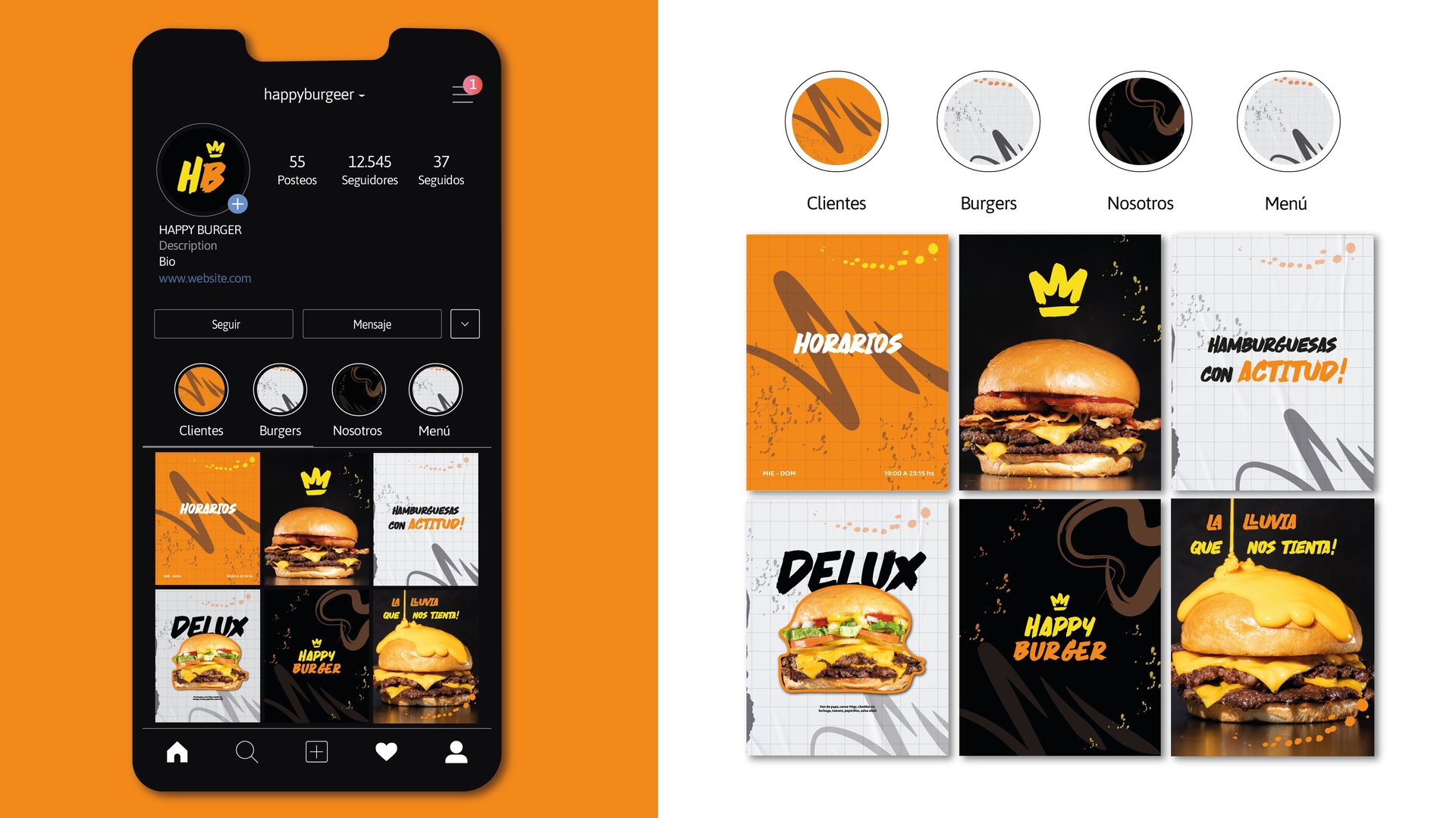 Una identidad urbana y original, pensada como un lienzo gráfico que rompe con lo común y transmite toda la actitud de sus hamburguesas. Colores, formas y tipografías que hablan el mismo idioma que el sabor: directo, auténtico y con onda. Cada detalle está diseñado para que la experiencia sea visual y gastronómica al mismo tiempo.